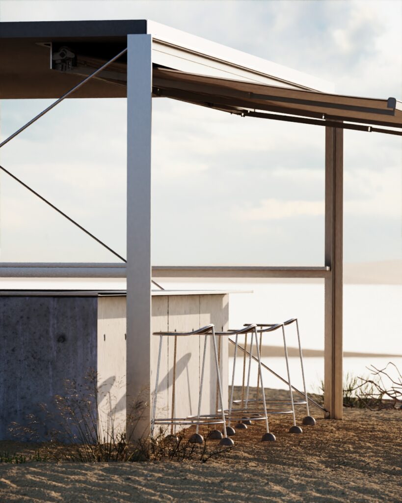 Quiosque de praia concebido como uma estrutura leve e precisa, implantada de forma a dialogar com a paisagem natural. A solução estrutural é composta por quatro pontos verticais metálicos, conectados por duas travas horizontais e estabilizados por dois tirantes diagonais, garantindo rigidez e clareza construtiva. A cobertura principal abriga toldos articulados que se estendem lateralmente, ampliando o espaço de sombreamento e permitindo maior flexibilidade de uso ao longo do dia.