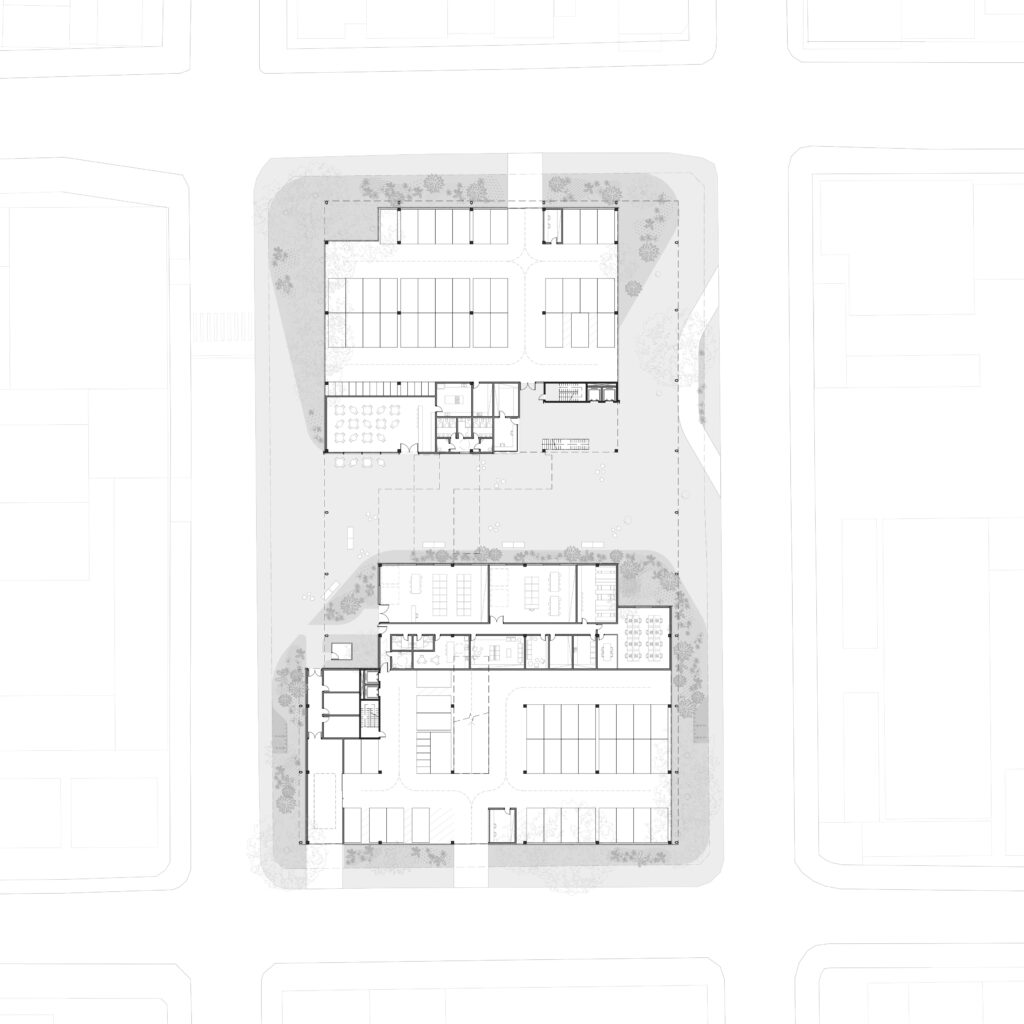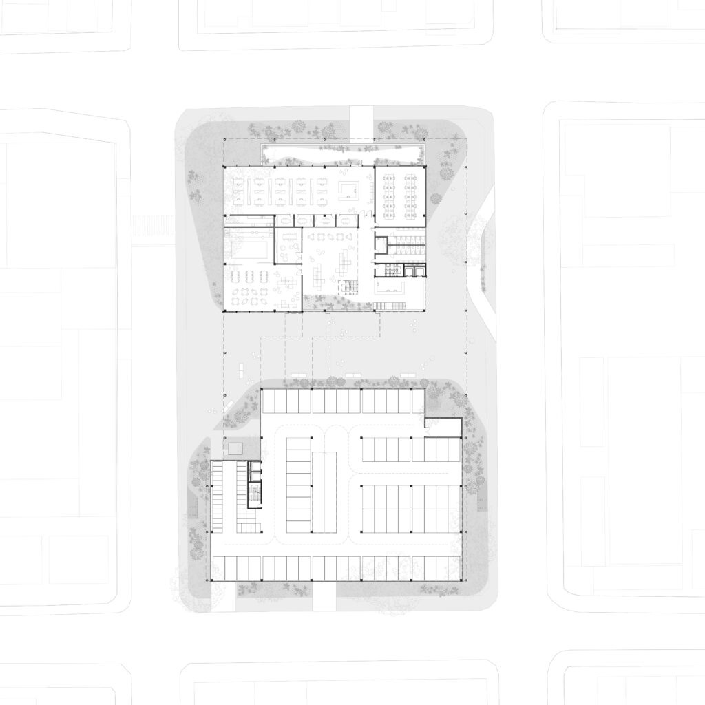 O partido formal é definido por uma praça central, concebida como átrio público de acesso, convivência e articulação urbana. A partir desse vazio estruturador se organizam dois bolsões de estacionamento, responsáveis por orientar fluxos e acessos. Desses espaços emergem dois blocos programáticos com seu próprio núcleo de circulação vertical: ao norte, a Zona B, dedicada ao atendimento e capacitações; ao sul, a Zona A, destinada aos espaços administrativos. Entre ambas se dispõem os ambientes compartilhados da Zona C, que integram as atividades do conjunto, enquanto as áreas técnicas da Zona D se distribuem conforme as demandas operacionais.