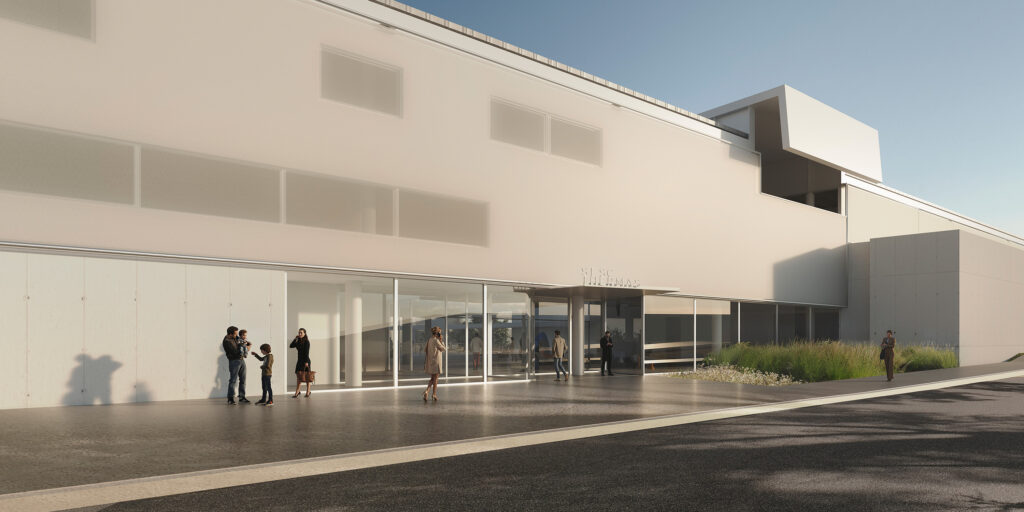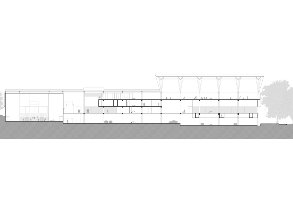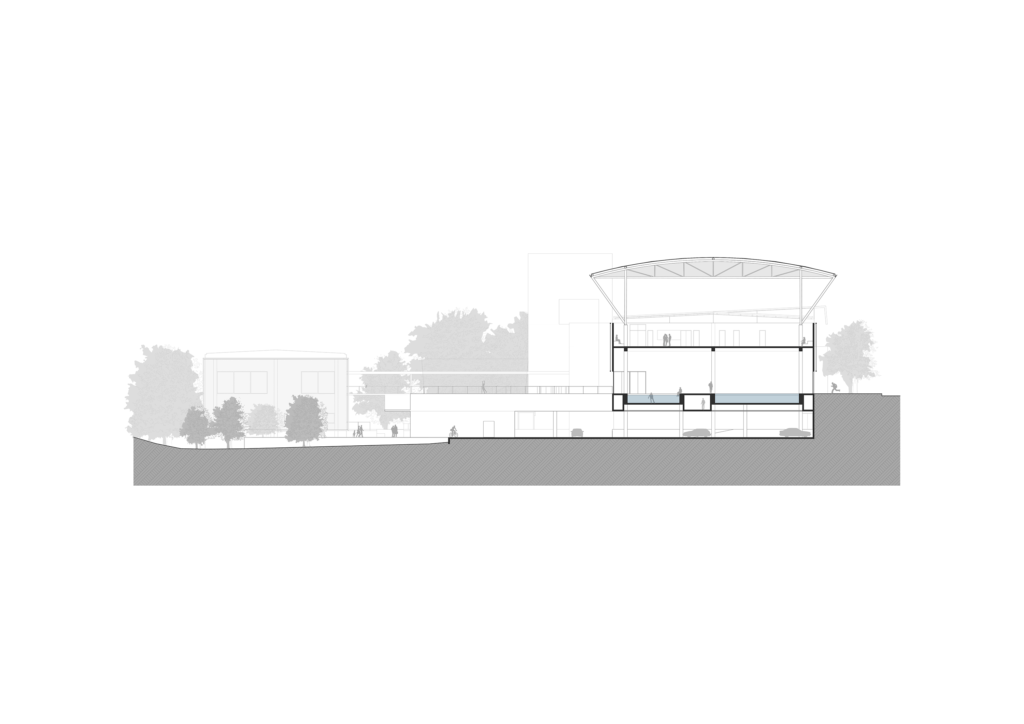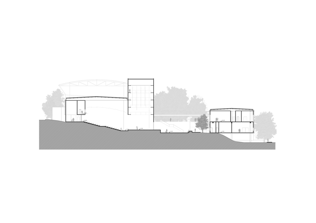 O principal volume construído se organiza linearmente próximo à mesma rua, o que garante a minimização do impacto sobre a vegetação existente e viabiliza uma solução de níveis oportuna para a solução dos estacionamentos. O conjunto se completa apenas com um volume menor que ajuda a configurar a praça superior e a praça inferior em frente ao palco reversível ao mesmo tempo que estabelece conexões importantes com a área mais central do terreno. A compacidade da arquitetura otimiza os custos da obra e simplifica a operação do edifício.