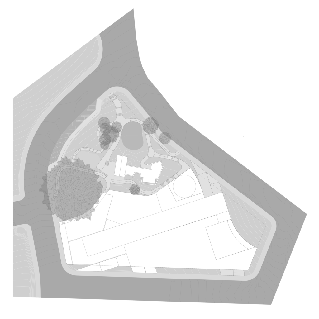 O grande espaço aberto, em conjunto com a edificação histórica preservada, configura-se como área de lazer e convivência, qualificando o conjunto por meio de áreas de estar generosas, visuais amplas e paisagismo integrado. A implantação se apropria da topografia existente como estratégia projetual, definindo diferentes setores e acessos, sempre orientados pela relação visual entre os níveis.