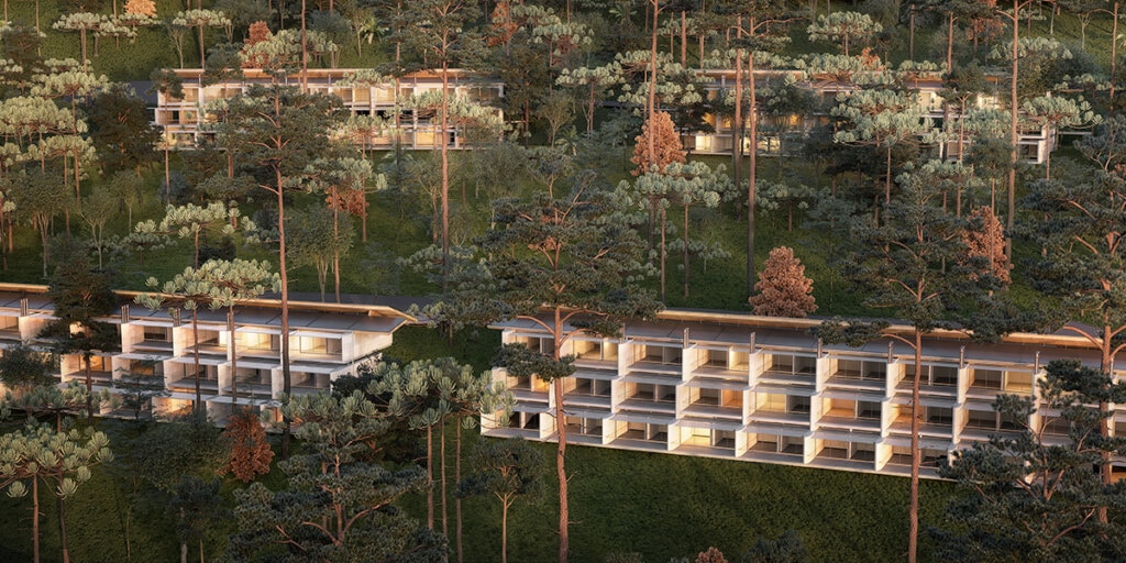 O hotel do complexo conta com 384 unidades de apartamentos, divididos em 15 edificações posicionadas levemente nas curvas do terreno. A escolha por edificações separadas visa não obstruir a paisagem com uma construção de proporções exageradas e ao mesmo tempo garantir a privacidade das pessoas que se hospedam no hotel. Os apartamentos têm vista para o declive do terreno e são orientados para o Norte, garantindo farta iluminação natural, característica de todo o complexo.