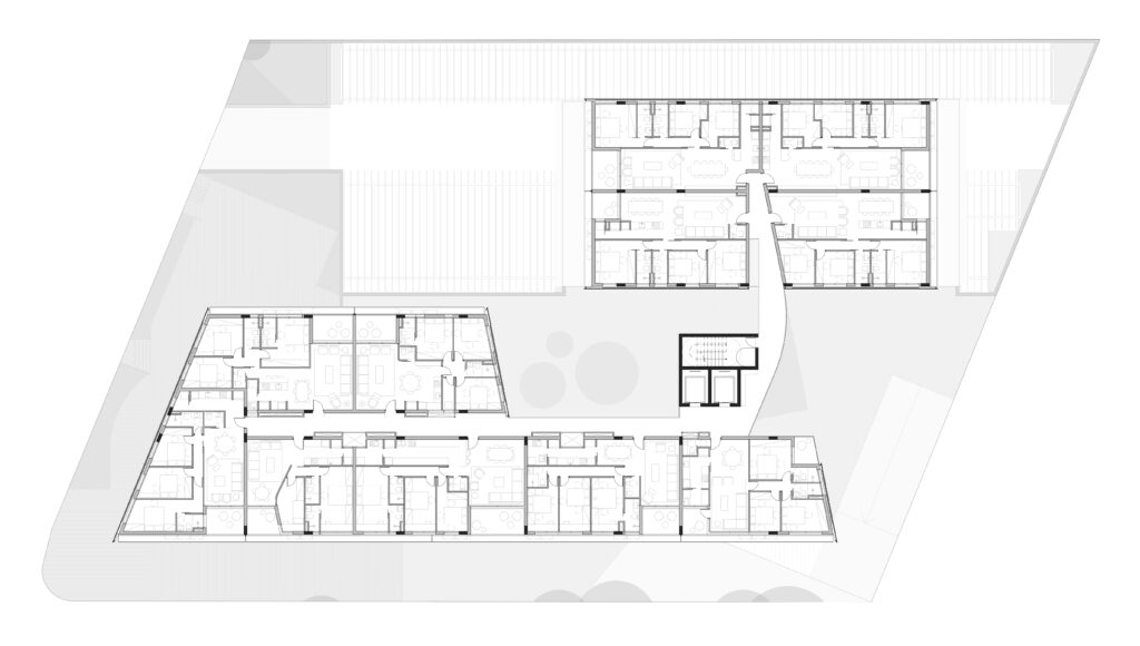 As residências criadas para o projeto buscam uma organização eficiente e confortável dos espaços internos através de uma articulação geométrica legível e de uma estratégia de ocupação que anteveja distintas possibilidades de redistribuição dos espaços internos de acordo com os critérios e particularidades de cada morador/a. A organização da planta também levou em conta a otimização da distribuição dos serviços, priorizando o alinhamento dos shafts para distribuição hidráulica, elétrica e de telefonia, visando otimizar os sistemas e oportunizar maior flexibilidade por meio da amplitude dos ambientes.